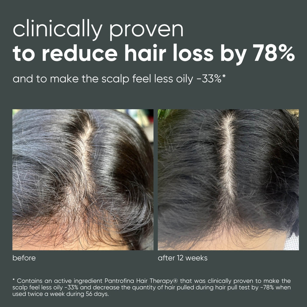 Contains an active ingredient Pantrofina Hair Therapy® (Tussilago Butterfara, Achillea Millefolium and Cinchona Berries extracts) that was clinically proven to make the scalp feel less oily -33% and decrease the quantity of hair pulled during hair pull test by -78% when used twice a week during 56 days.