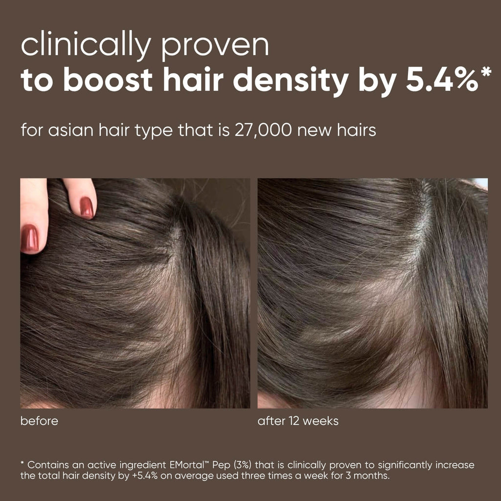 Contains an active ingredient EMortal™ Pep (3%) that is clinically proven to significantly increase the total hair density by +5.4% on average used three times a week for 3 months.⁠